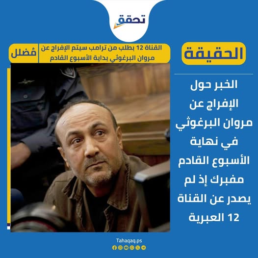 تداولت صفحات عبر مواقع التواصل خبراً نُسب إلى القناة 12 الإسرائيلية، يزعم أن الرئيس الأميركي دونالد ترامب طلب من إسرائيل الإفراج عن القيادي الفلسطيني مروان البرغوثي بداية الأسبوع المقبل.