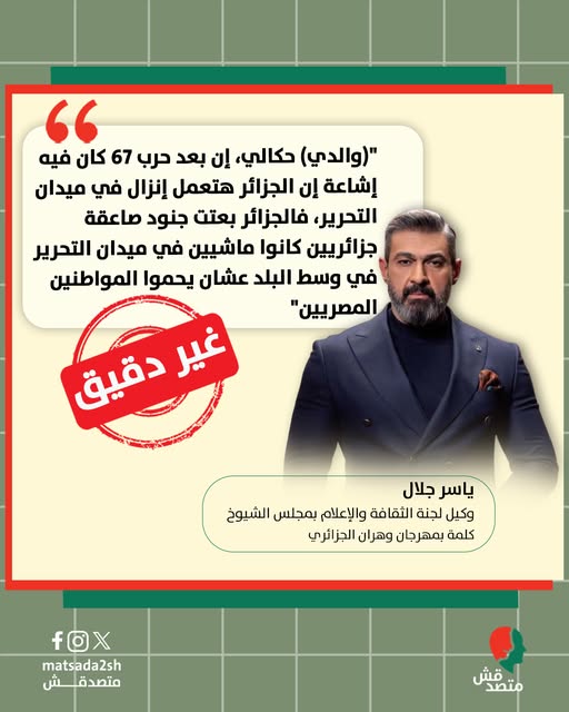 تداول مستخدمون تصريحات منسوبة للفنان لياسر جلال، الذي يشغل حاليا منصب وكيل لجنة الثقافة والإعلام بمجلس الشيوخ المصري، زعمت أن الجزائر أرسلت جنود صاعقة لحماية ميدان التحرير بالقاهرة بعد هزيمة حزيران/ يونيو 1967.
