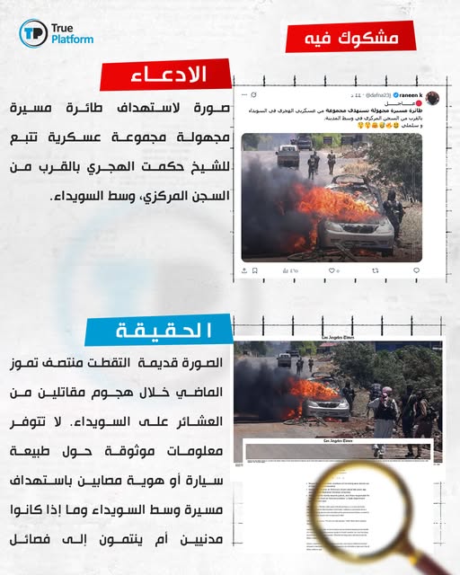 التفنيد الذي أجرته منصة «ترو بلاتفورم» أظهر أن الصورة قديمة، وتعود لمقاتلين من البدو والعشائر بجانب سيارة محترقة عند المدخل الغربي للمدينة في منتصف تموز/ يوليو 2025.