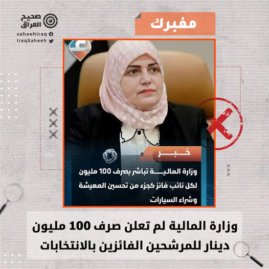 في ذات السياق، تداولت حسابات على وسائل التواصل الاجتماعي خبراً حول مباشرة وزارة المالية العراقية صرف 100 مليون دينار عراقي لكل نائب فائز كجزء من "تحسين المعيشة وشراء السيارات".