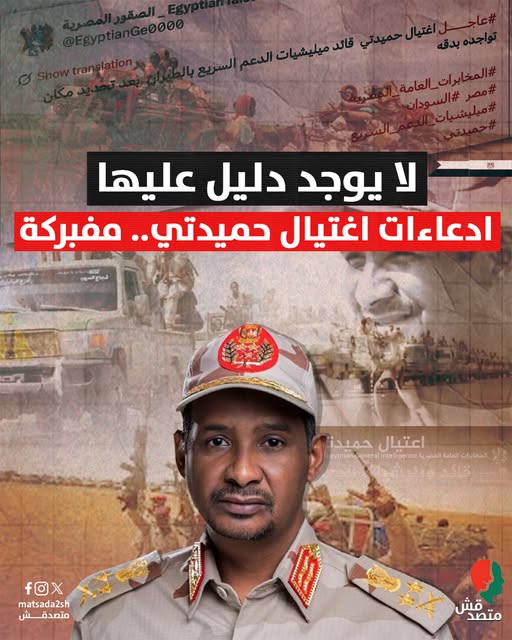 في السودان حققت منشورات ومقاطع فيديو تدعي اغتيال حميدتي تداولاً واسعاً على مواقع التواصل الاجتماعي. غير أن منصة "متصدقش" كشفت أن هذا الادعاء مفبرك، حيث لم تنشر أي جهة رسمية موثوقة محلية أو دولية، خبر الاغتيال أو إصابة حميدتي خلال المعارك الأخيرة.