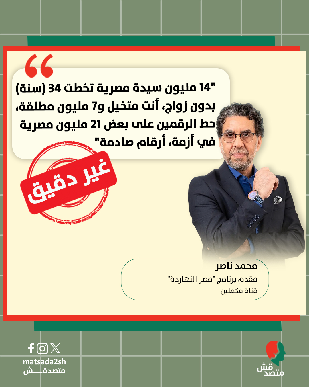 دقّقت منصة متصدقش في الأرقام التي ذكرها ناصر، وأثبتت أنها غير دقيقة، إذ إن آخر تعداد سكاني رسمي يعود إلى كانون الأول/ ديسمبر 2017، وقد ورد فيه أن عدد المطلقات في مصر حينها بلغ 461.7 ألفاً فقط، وهو ما يناقض تماماً الادعاء بوجود 7 ملايين مطلقة في البلاد. واستعانت المنصة بخبير في الدراسات السكانية الذي أكد بدوره أن رقم 14 مليون سيدة فوق 34 عاماً نسبة غير منطقية على الإطلاق، موضحاً أن الهيكل العمري الوارد في الإسقاطات السكانية الرسمية يُظهر أن إجمالي عدد الإناث المصريات فوق 34 عاماً يقدَّر بنحو 17.3 مليون سيدة.