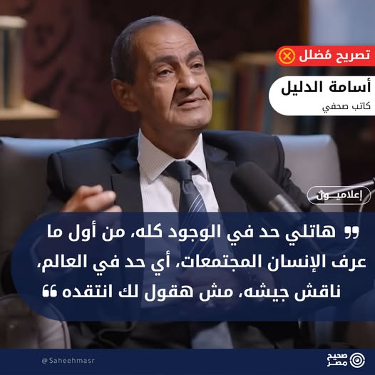 زعم الكاتب المصري أسامة الدليل، في لقاء تلفزيوني، أنه لا يوجد في التاريخ أحد قام بمناقشة جيشه أو انتقاده.