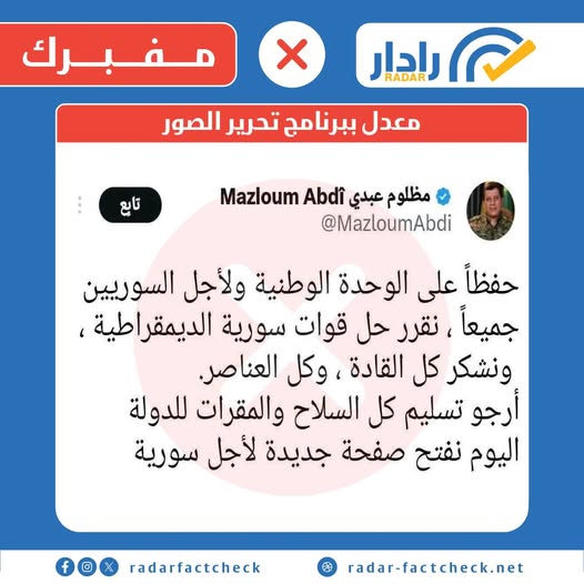 فنّدت منصتا "رادار" و"ترو بلاتفورم" الادعاء، وأثبتتا أنه مفبرك وغير صحيح، إذ لم تنشر التغريدة على الحساب الرسمي والموثوق لعبدي على "إكس"، فضلاً عن وجود أخطاء إملائية واختلاف واضح في نمط الخط وتنسيق النص مقارنة بالتغريدات الأصلية، ما يعكس التلاعب بها تقنياً وعدم وجود أساس لها من الصحة. كذلك، نفى المركز الإعلامي لـ"قسد" صحة التصريح المزعوم.