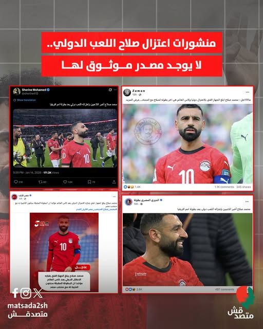 عقب هزيمة المنتخب المصري الأول لكرة القدم أمام نظيره السنغالي بهدف وحيد دون رد، في نصف نهائي كأس الأمم الأفريقية 2025 التي استضافتها المغرب، انتشرت على نطاق واسع على مواقع التواصل الاجتماعي منشورات تزعم إبلاغ قائد المنتخب المصري، محمد صلاح، الجهاز الفني باعتزاله اللعب الدولي.