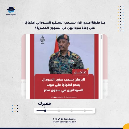 ختاماً في السودان، ادّعت حسابات عبر مواقع التواصل الاجتماعي أنّ رئيس مجلس السيادة الحاكم في البلاد، عبد الفتاح البرهان، أصدر قراراً بسحب السفير السوداني لدى القاهرة، احتجاجاً على وفاة مواطنين سودانيين داخل السجون المصرية، مؤكداً أن "كرامة السودانيين فوق كل اعتبار".