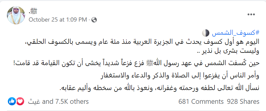 - بوست منتشر بشكل كبير جدًا جدًا بيقول: "اليوم هو أول كسوف يحدث في الجزيرة العربية منذ مئة عام ويسمى بالكسوف الحلقي، وليست بشرى بل نذير ..". ![]()