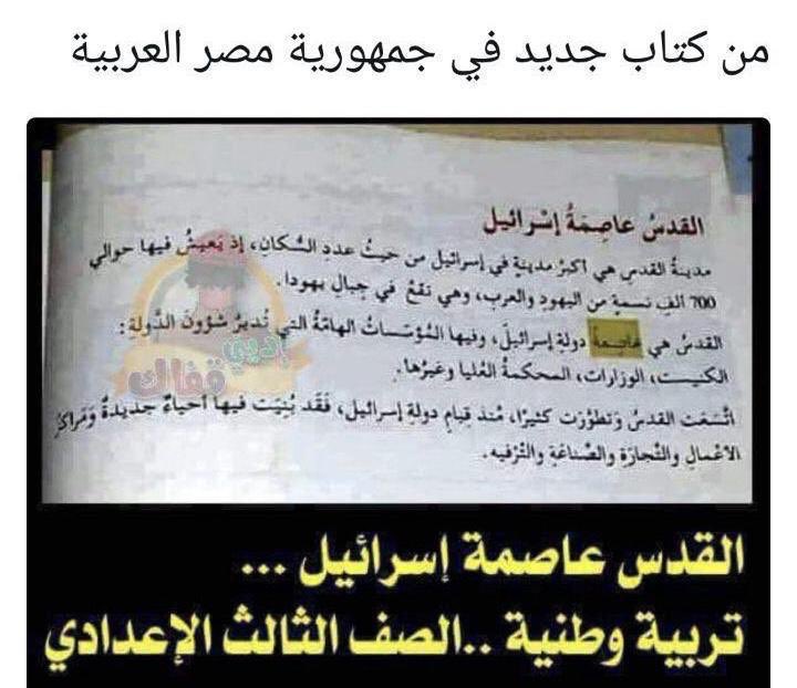 – الكلام ده غير صحيح. ده كتاب إسرائيلي باللغة العربية اسمه “الحياة معًا في إسرائيل” بيدرس للصف الرابع في مدارس ابتدائية بمنطقة القدس الشرقية للعرب اللي عايشين فيها. وفي المصادر اللي بننشرها في أول كومنت في نسخة من الكتاب والصفحة دي هي صفحة 22 فيه.✅✅