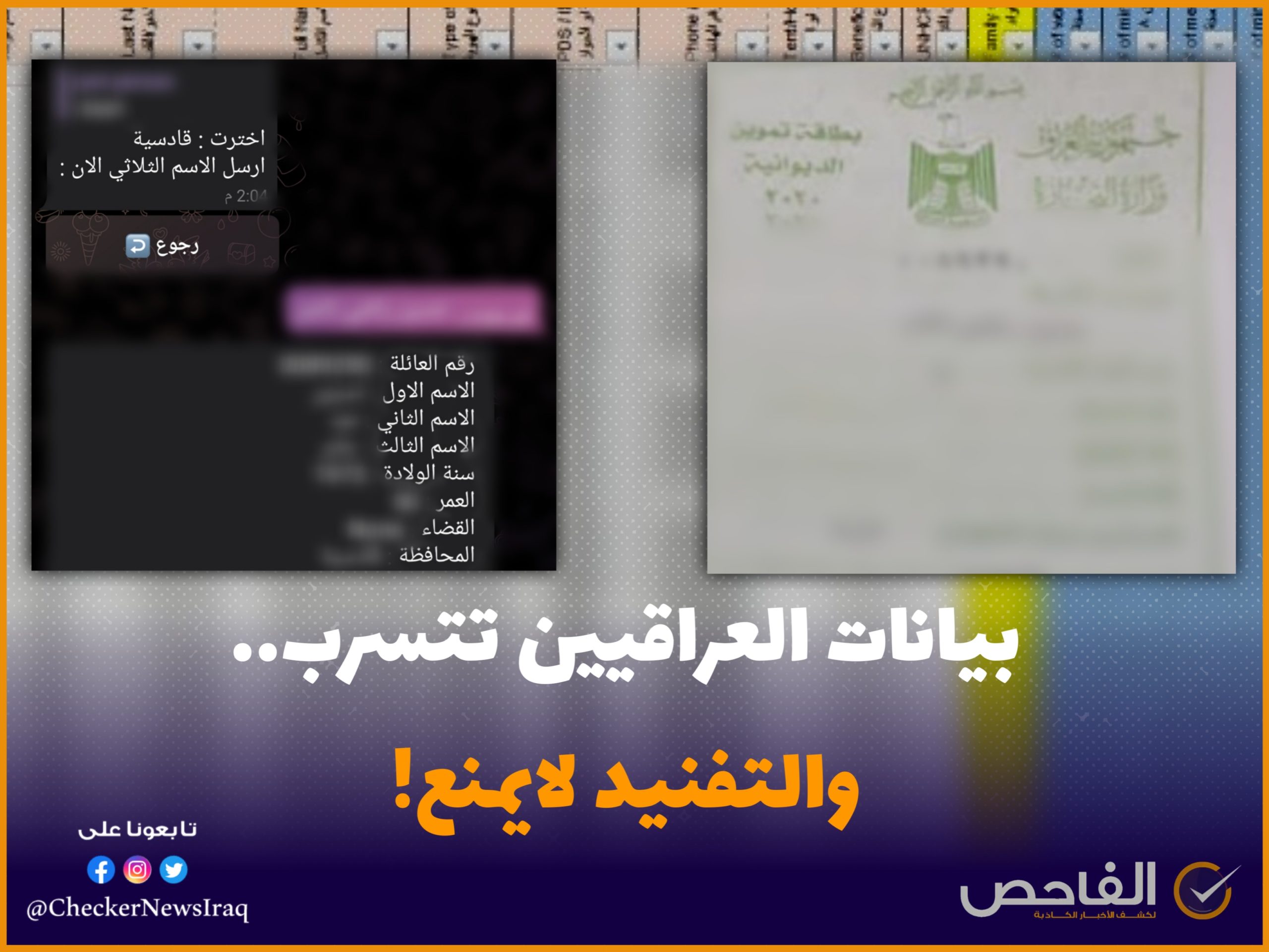 1- البيان كاذب، لا صحة لما ذكرته وزارة التجارة العراقية حول عدم تسرّب بياناتها، حيث عمل فريق الفاحص على كشف الحقيقة وتوصّل إلى بيانات البطاقة التموينية للمواطنين العراقيين وهي منتشرة بشكل مفتوح المصدر في قنوات على تطبيق تيليجرام، كما أن البيانات تطابق الوثائق الأصلية.