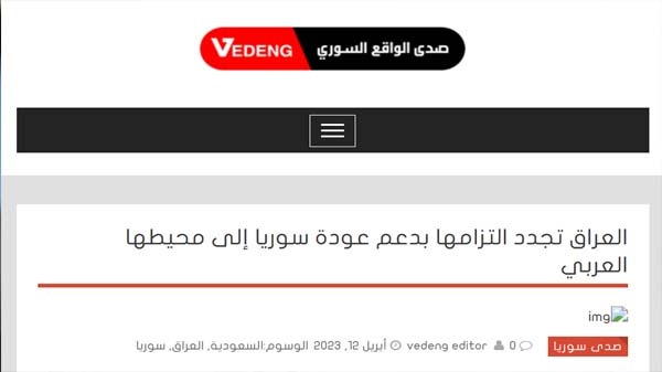 تحت عنوان "العراق تجدد التزامها بدعم عودة سوريا إلى محيطها العربي"، نشرت وكالة "صدى الواقع السوري Vedeng " والتي تنشط في شمال شرقي سوريا، في 12 نيسان/أبريل 2023، خبراً عن جهود إعادة الحكومة السورية إلى جامعة الدول العربية.