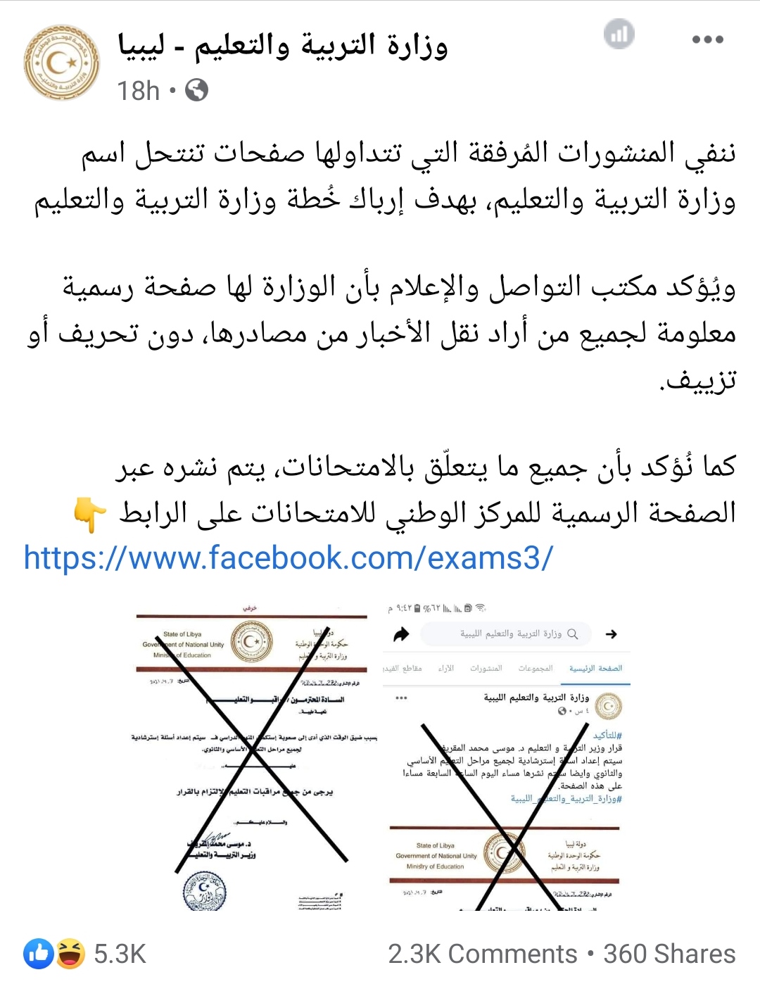 ونفت بدورها وزارة التربية والتعليم الليبية عبر صفحتها الرسمية على فيسبوك صحة هذا القرار، كما أكدت الوزارة بأن جميع ما يتعلق بالامتحانات يتم نشره عبر الصفحة الرسمية للمركز الوطني للامتحانات https://www.facebook.com/exams3/.
