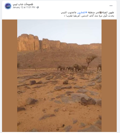 تداولت صفحات التواصل الاجتماعي الليبية صورة لفِيَلَة في منظقة صحراوية مدعيين أنها التقطت في منطقة القطرون في الجنوبي الليبي.