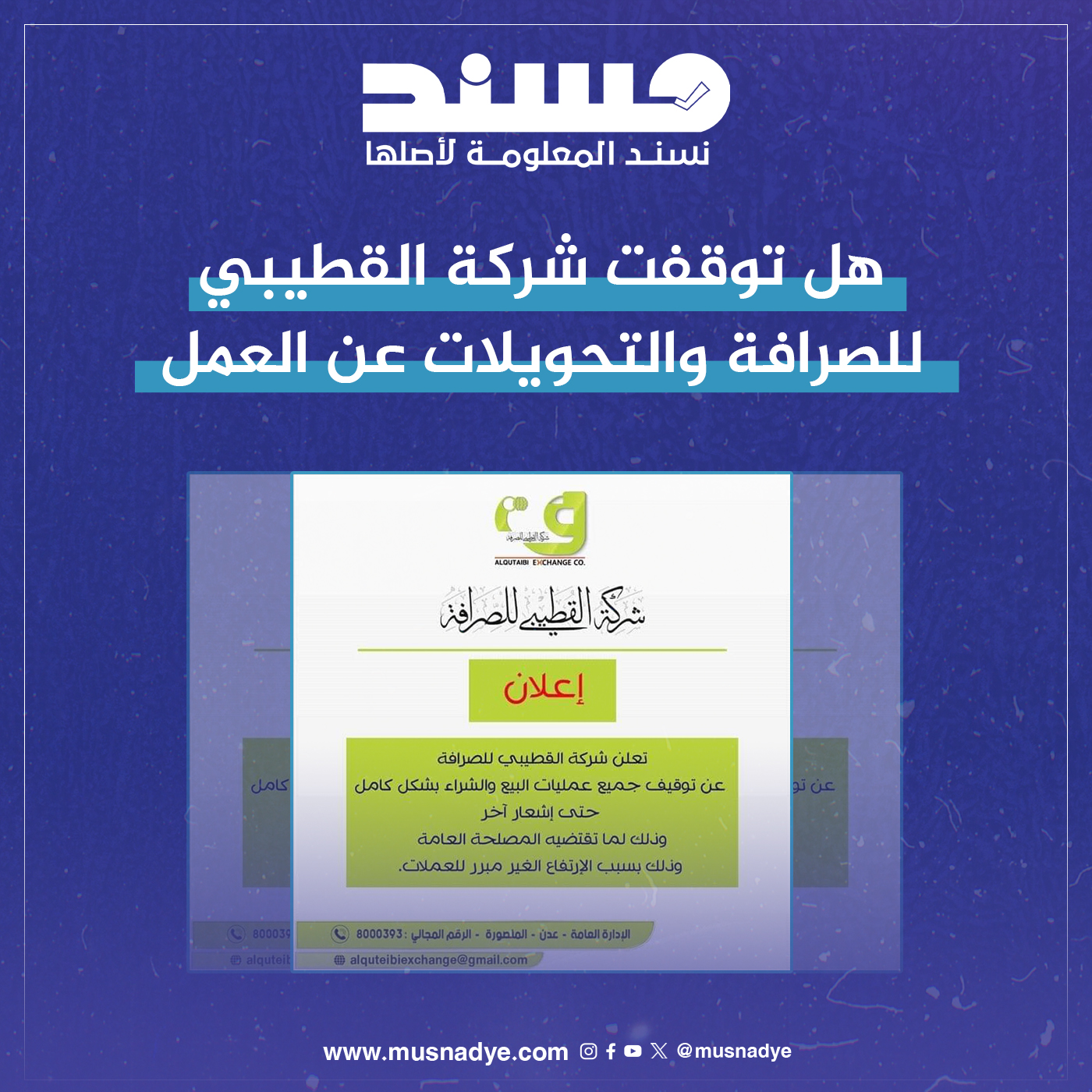 شركة القطيبي للصرافة عن العمل، مؤكداً أن الصفحة الرسمية للشركة لم تنشر أي إعلان