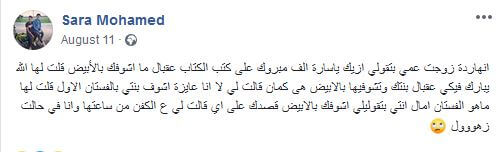 انهاردة زوجت عمي بتقولي ازيك ياسارة الف مبروك على كتب الكتاب عقبال ما اشوفك بالأبيض قلت لها الله يبارك فيكي عقبال بنتك وتشوفيها بالابيض هى كمان قالت لي لا انا عايزة اشوف بنتي بالفستان الاول قلت لها ماهو الفستان امال انتي بتقوليلي اشوفك بالابيض قصدك على اي قالت لي ع الكفن من ساعتها وانا في حالت زهووول 🙄