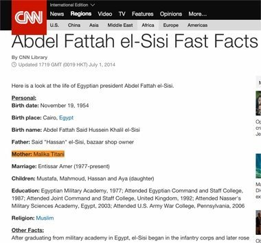 أولا CNN كاتبين ان اسم الأم مليكة تيتاني فعلا بس من غير أي مصدر للمعلومة .. غير انهم كاتبين معلومة تانية غلط ( ان السيسي بقى رئيس المخابرات الحربية في فبراير 2011 مع انه كان رئيسها من 2010)