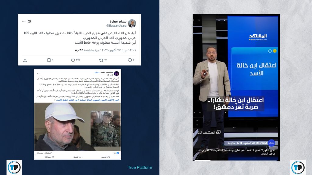 ✅الادعاء حول اعتقال اللواء طلال مخلوف قائد الحرس الجمهوري في جيش النظام السوري السابق، #مشكوك_فيه.