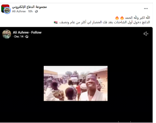 تداولت العديد من الحسابات على «فيسبوك» مقطع فيديو يظهر فيه شخص يصوّر دخول عدد من الشاحنات إلى منطقة ما، على أنه مقطع يوثق دخول شاحنات إلى مدينة «الدلنج» بولاية جنوب كردفان، بعد فك الحصار الذي استمر عامًا ونصف – وفق ما جاء في الادعاء.