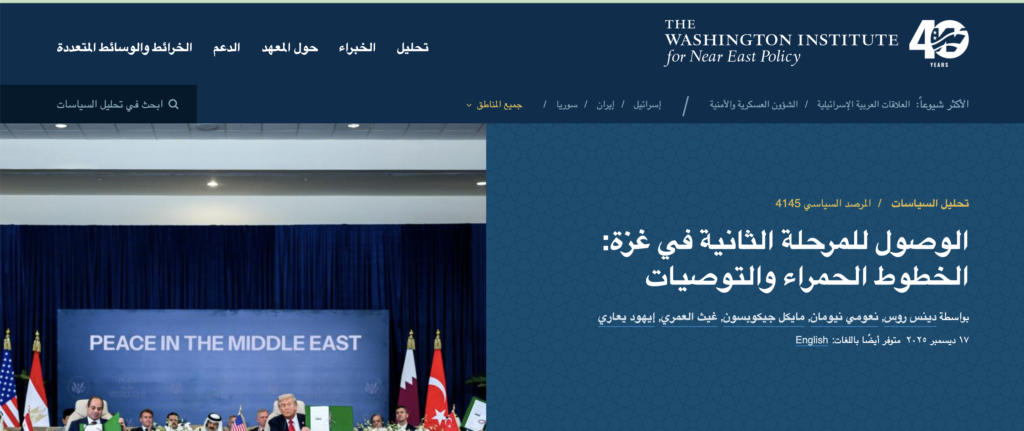 وبالعودة إلى أحدث تقرير صادر عن معهد واشنطن لسياسة الشرق الأدنى بتاريخ 17/12/2025 بعنوان: "الوصول للمرحلة الثانية في غزة: الخطوط الحمراء والتوصيات"، فقد تناول الباحثون والمسؤولون الأميركيون السابقون ملامح المرحلة الثانية من اتفاق وقف إطلاق النار في غزة، مركّزين على القضايا المتعلقة بالإشراف الأميركي، وتعثر تشكيل قوة الاستقرار الدولية، والخطوط الحمراء الإسرائيلية، ومعارضة حماس للترتيبات متعددة الأطراف، ودور السلطة الفلسطينية في المرحلة المقبلة.