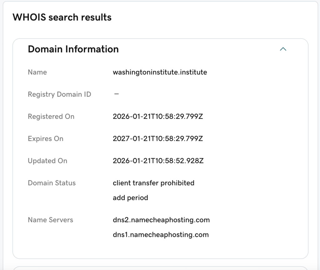 تحقق مرصد كاشف من صحة المعلومات، ووجد أن التقرير مزيف وصادر عن موقع مُزور يحاكي اسم وتصميم الموقع الأصلي لمعهد واشنطن لسياسة الشرق الأدنى، أظهر فحص النطاق عبر خدمة GoDaddy WHOIS أن الموقع قد أُنشئ بتاريخ 21/1/2026، وهو يختلف كليًا عن النطاق الرسمي للمعهد (washingtoninstitute.org). كما تبيّن أن الموقع مستضاف عبر خوادم Namecheap (dns1.namecheaphosting.com – dns2.namecheaphosting.com)، وهي خوادم يمكن لأي شخص استخدامها، وأن النطاق مسجَّل لمدة عام واحد فقط. إضافة إلى ذلك، لم تُظهر بيانات WHOIS أي معلومة عن الشخص أو الجهة التي تملك أو تدير هذا الموقع.