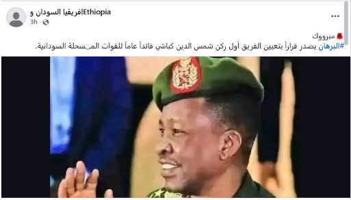 تداولت حسابات على منصة «فيسبوك» ادعاءً يفيد بأنّ رئيس مجلس السيادة الحاكم في السودان عبد الفتاح البرهان أصدر قرارًا بتعيين الفريق أول شمس الدين كباشي قائدًا عامًا للقوات المسلحة السودانية.
