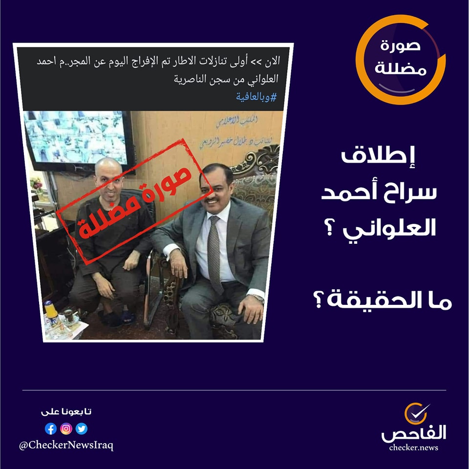 1- الصورة مضللة. حيث تعود الصورة للعام 2019 وهي لزيارة النائب طلال الزوبعي الى احمد العلواني في المعتقل. 2- لم يتم الإعلان عن خبر يخص الإفراج عن أحمد العلواني سواء من قبل مصادر إعلامية حكومية أو غير حكومية.