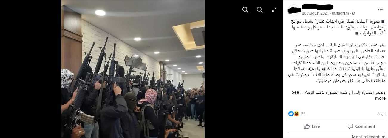 بعدها بأيام نشرت العديد من الصفحات اللبنانية، منها صفحة أحد نواب البرلمان اللبناني، صورة لمسلحين قيل إنهم من بلدة عكار، وركزت المنشورات على غلو الأسلحة بينما يعاني أبناء البلدة من الفقر.