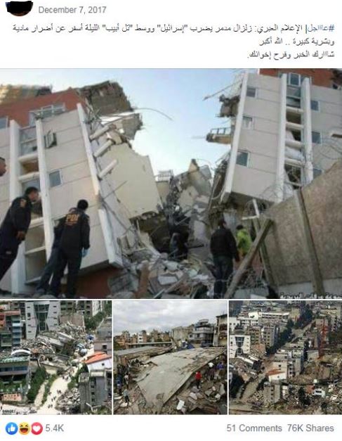 في ديسمبر من عام 2017 انتشر منشورًا يضم 4 صور ادعى ناشروهم أنهم يصورون زلزالًا عنيفًا ضرب تل أبيب، لكن في حقيقة الأمر هذا الادعاء غير صحيح.