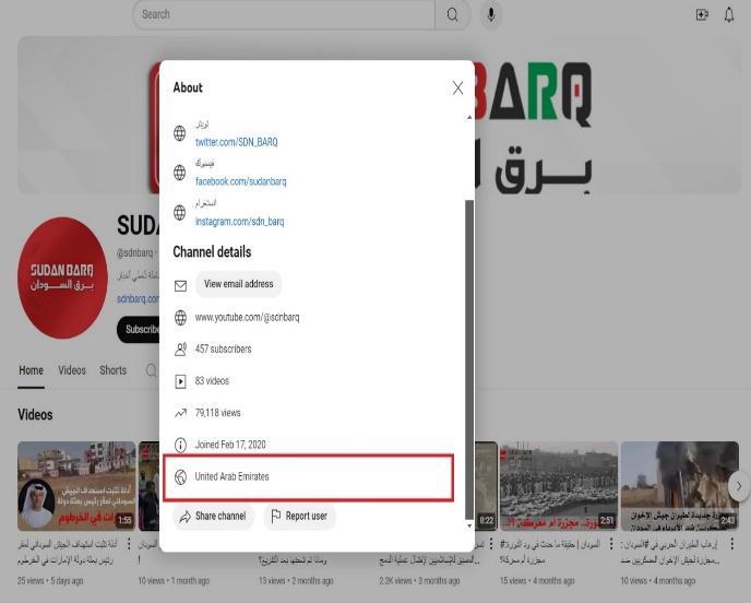 On X, "Sudan Barq" states that it is based in the famous Mek Nimir Street in Khartoum. However, the transparency data for the account’s Facebook page reveals that three of the page's administrators have unknown geographic locations. Additionally, the data for the site's YouTube channel, established on February 17, 2020, indicates that it is managed from the United Arab Emirates.