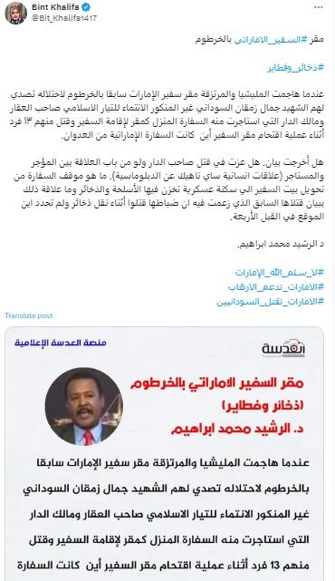 Meanwhile, accounts supporting the RSF and the UAE launched another campaign on "X" to attack the Sudanese army shortly after the UAE accused the army of bombing the residence of the UAE ambassador in Khartoum, promoting misleading information in this regard. In a press conference in New York late September 2024, army commander Abdel Fattah Al Burhan accused Abu Dhabi of providing support to Hemedti's forces. The Sudanese Ministry of Foreign Affairs denied the bombing of the ambassador's residence, stating that his condition is good and that the residence is not being used as a diplomatic mission.