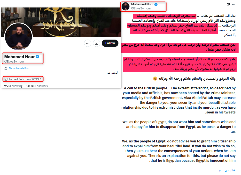 Mohamed Nour's account, "@Elwa3y_nour," was the most influential in terms of reach, with its posts gaining wide interaction on both Facebook and X. Nour wrote several posts on both platforms describing Alaa Abdel Fattah as an extremist, a terrorist, and calling for the revocation of both his British and Egyptian nationalities.