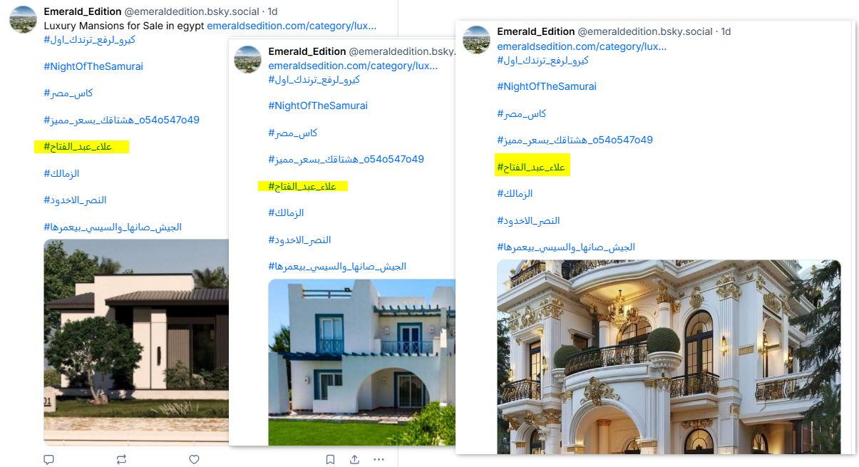 The account @emeraldedition.bsky.social then appeared on the Bluesky, with 22 published 22. This is an entirely commercial account, as is evident from its posts, which repeated the hashtag #علاء_عبد_الفتاح (Alaa Abdel Fattah) along with several other hashtags in commercial posts.