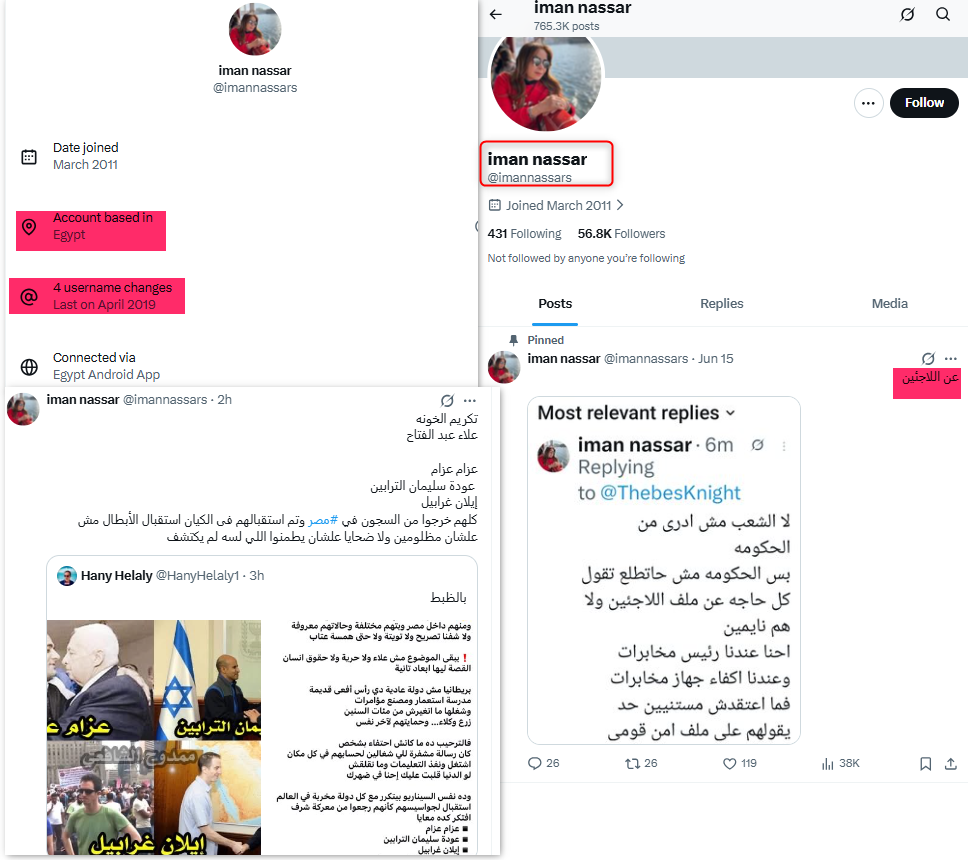Second was an account named "@imannassars" whose posts focus on incitement against refugees, support for the Egyptian regime, and labeling any opposition to it as treasonous.
