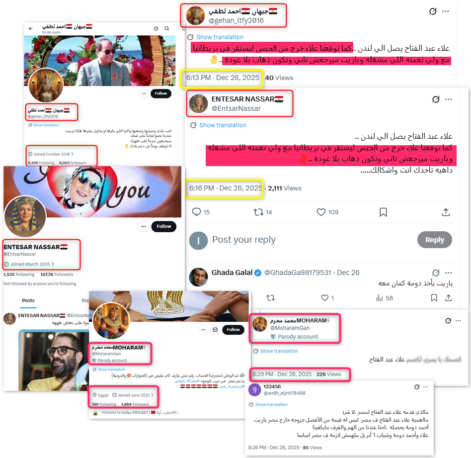 In September 2025, Alaa Abdel Fattah was released from prison by way of a presidential pardon, after nearly 10 years in incarceration. On December 26, 2025, Abdel Fattah and his mother, Laila Soueif, announced his arrival in Britain, prompting accounts supporting the Egyptian regime—many of which using AI-generated imagery and slogans featuring Pharaonic themes—to celebrate his departure from Egypt and call for other activists to follow suit.