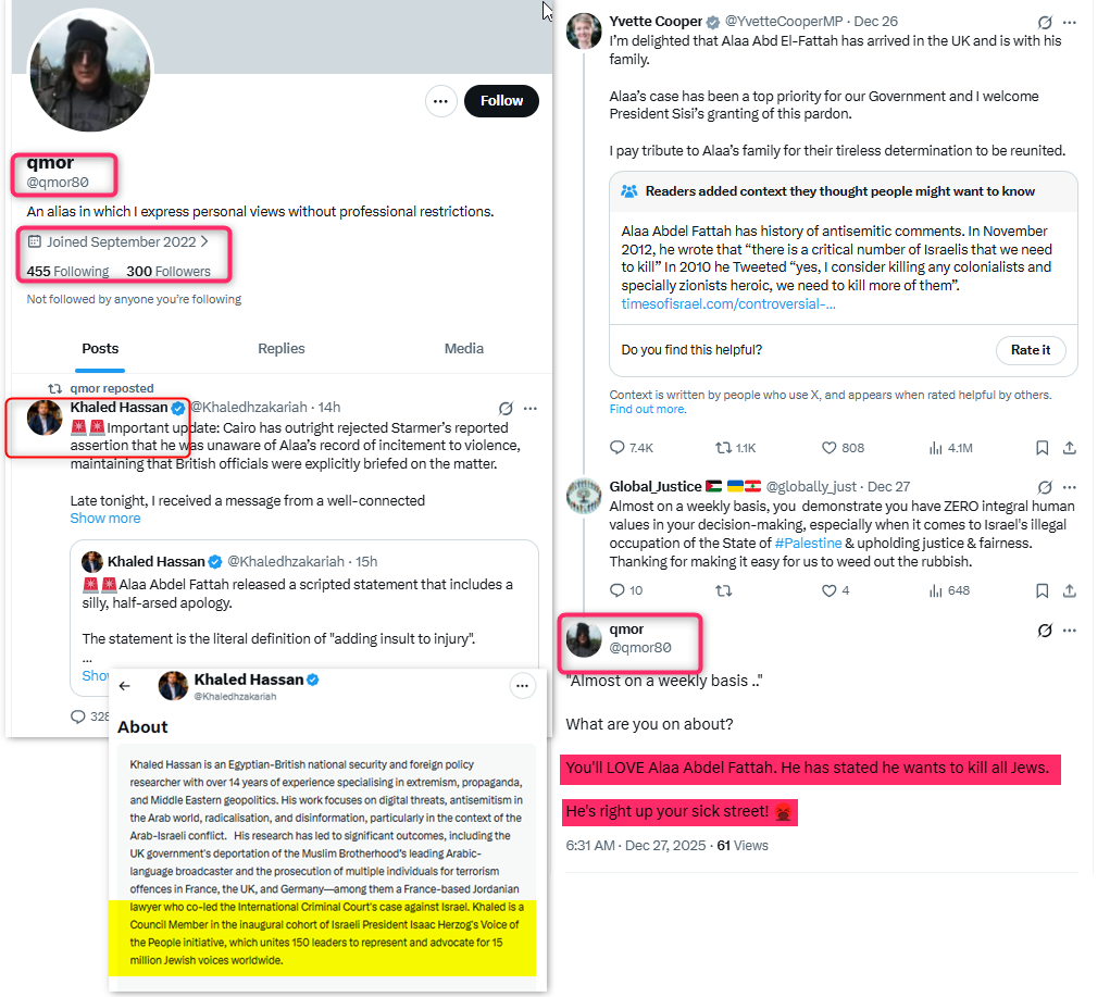 The account @qmor80 was also one of the first to incite against Abdel Fattah, accusing him of "wanting to kill all Jews." This account, recently created and registered in the United Kingdom, reposts content from a British-Egyptian activist named "Khaled Hassan @Khaledhzakariah." Hassan describes himself as someone who "converted from Islam to Judaism" and also as a "member of the opening group council of the People's Voice initiative." This initiative was launched by Israeli President Isaac Herzog and aims to unite 150 leaders representing 15 million Jews.