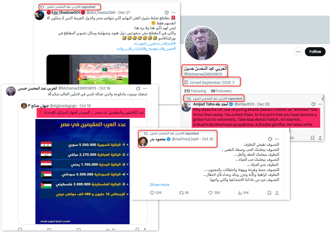 Another account "Al-Harbi Abdel Mohsen Hussein" appeared on the list. The account was recently created in 2025, and has published 16 posts about Alaa Abdel Fattah. It also constantly interacts with fake Egyptian accounts that participated in previous incitement campaigns as uncovered by Arabi Facts Hub. It frequently republishes posts from pro-Israeli accounts, such as Amjad Taha, and posts inciting against refugees. It also interacts with accounts affiliated with the Egyptian regime, such as Mahmoud Badr.
