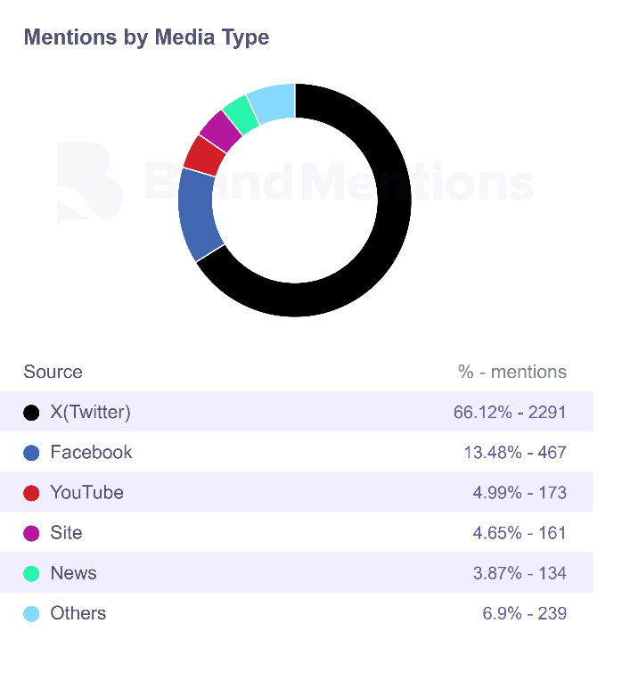 The posts were distributed across a large number of social media platforms, with X accounting for 66% of total posts related to "Alaa Abdel Fattah," followed by Facebook with about 13% of total posts, and then YouTube with about 5% of the posts.