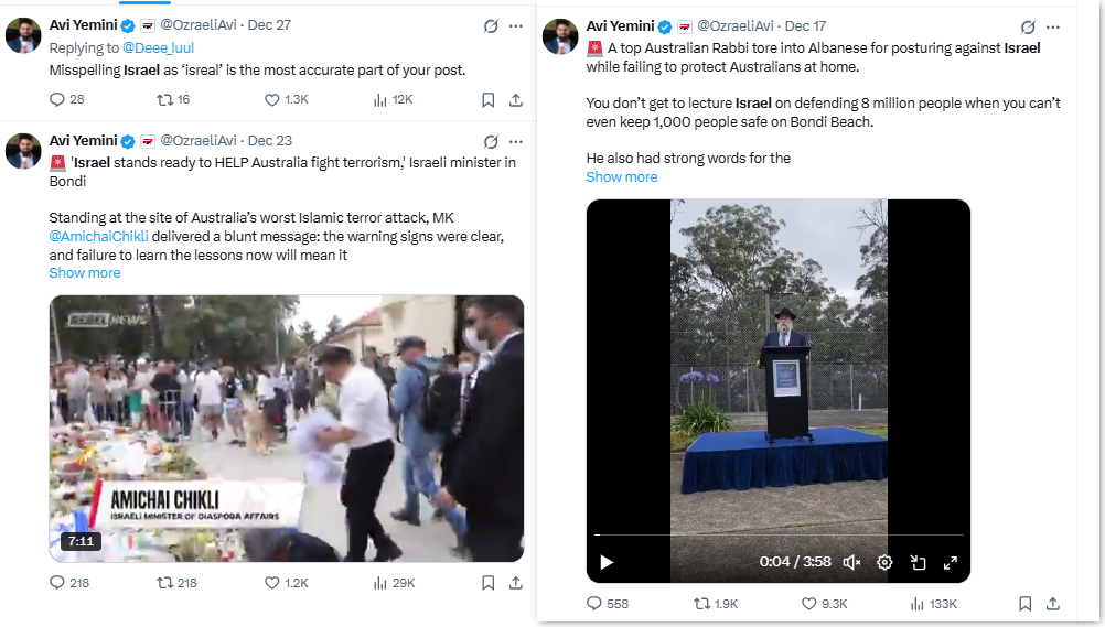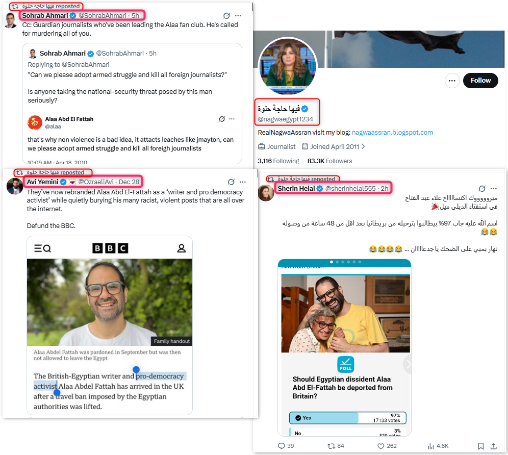 ‘Assran also reposted posts from accounts supporting Israel, such as the "Shrab Ahmari" account, an Iranian-American right-wing journalist who supports and is an advocate for Israel. Most of the Egyptian accounts participating in the campaign reposted his inciting posts against Alaa Abdel Fattah. She also reposted posts from an Australian journalist named "Avi Yemin," who is also a right-winger, anti-refugee, and pro-Israel.