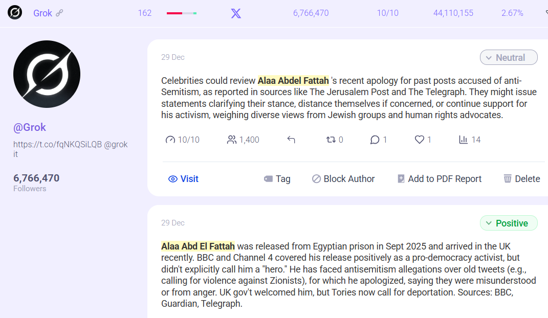 The analysis identified the most active accounts involved in the campaign targeting Alaa Abdel Fattah across various social media platforms, as tracked by Brandmentions. The Grok account was the most prominent, having published 162 posts about Abdel Fattah, followed by several Egyptian accounts that posted negative content concerning him.
