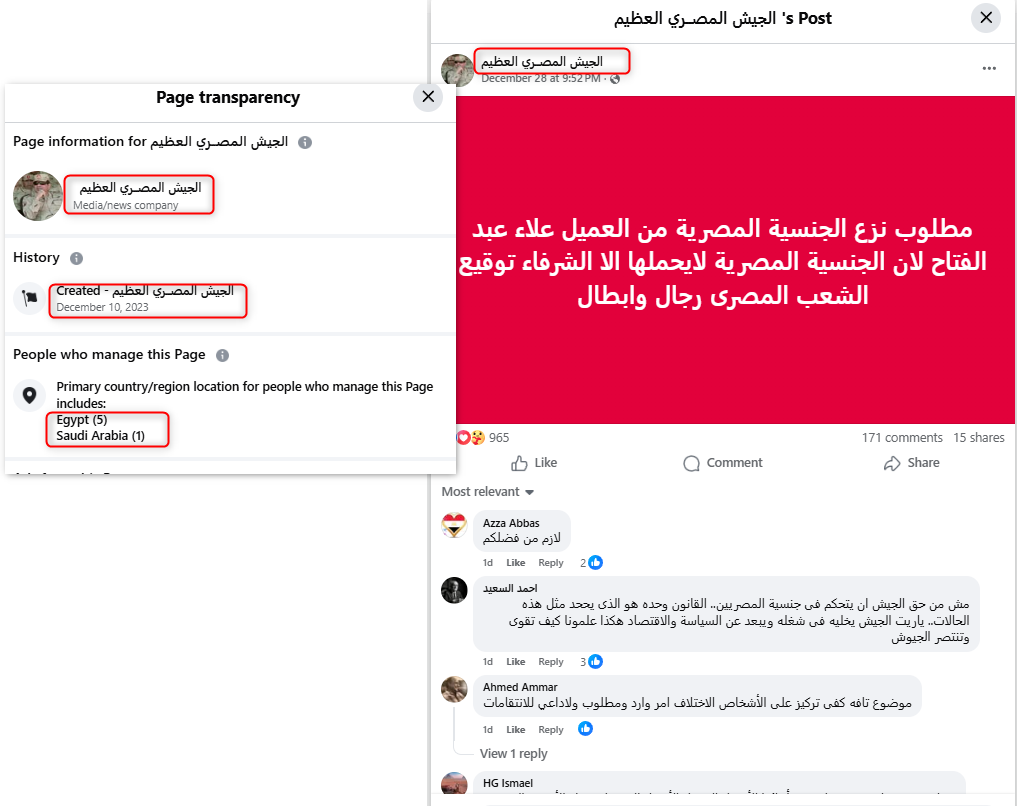 A post from the page "The Great Egyptian Army" also received significant engagement, reaching around 1,000 interactions and 171 comments. The post included a request to strip Abdel Fattah of his Egyptian citizenship.