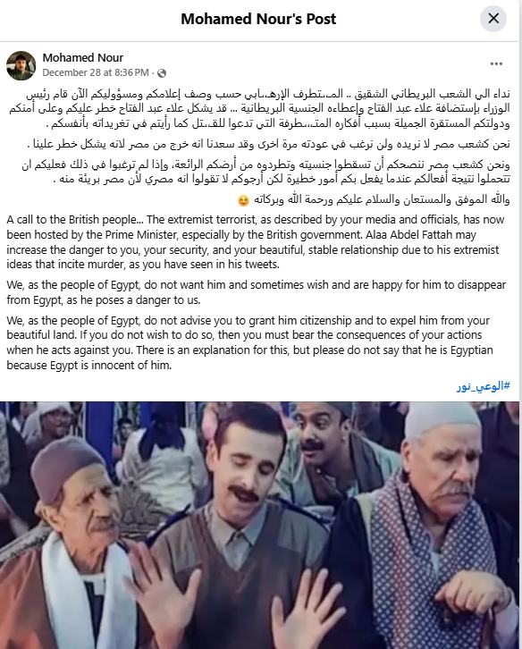 Starting December 27, a coordinated campaign of incitement began, aimed at demonizing Alaa Abdel Fattah. The campaign sought to portray him as a violent extremist, anti-Jewish, an inciter of violence, and anti-British. This escalation led to demands that he be stripped of his British citizenship and expelled from Europe.