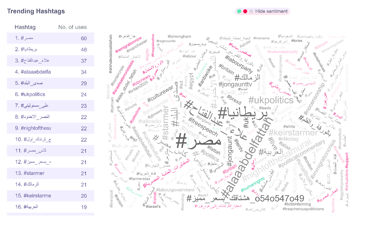 Concurrently with this campaign, which involved British Yemeni accounts and pro-Israel accounts, an Arabic-language campaign was launched by Egyptian accounts supporting the Egyptian regime. The discourse gradually shifted from advocating for his deportation from Britain to demanding the revocation of his Egyptian citizenship, according to an analysis by the Matsada’sh platform.
