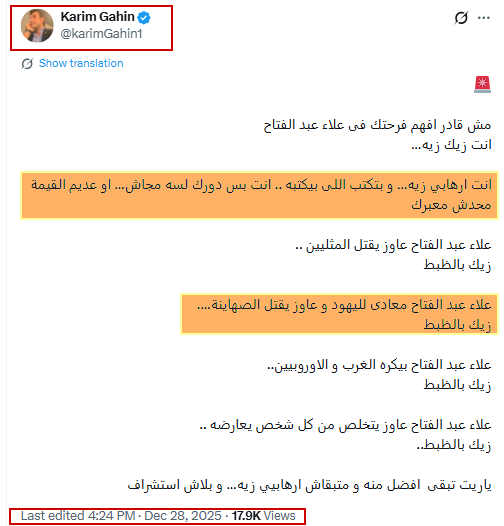 In addition, a post on X by the account "@karimGahin1" attacking Alaa Abdel Fattah, received about 18 thousand views. The owner of this account is a supporter of Israel.