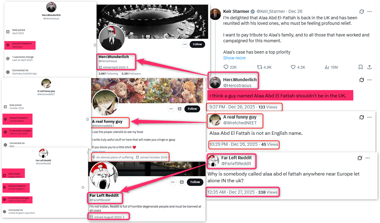 Upon the Egyptian activist Alaa Abdel Fattah's arrival in the United Kingdom on December 26, 2025—following years of imprisonment and a subsequent travel ban in Egypt—he was immediately targeted. A coordinated attack emerged from what appeared to be fake, pro-Israel social media accounts. These accounts republished old tweets of his, coupled with accusations of antisemitism, and called for his deportation from the UK.