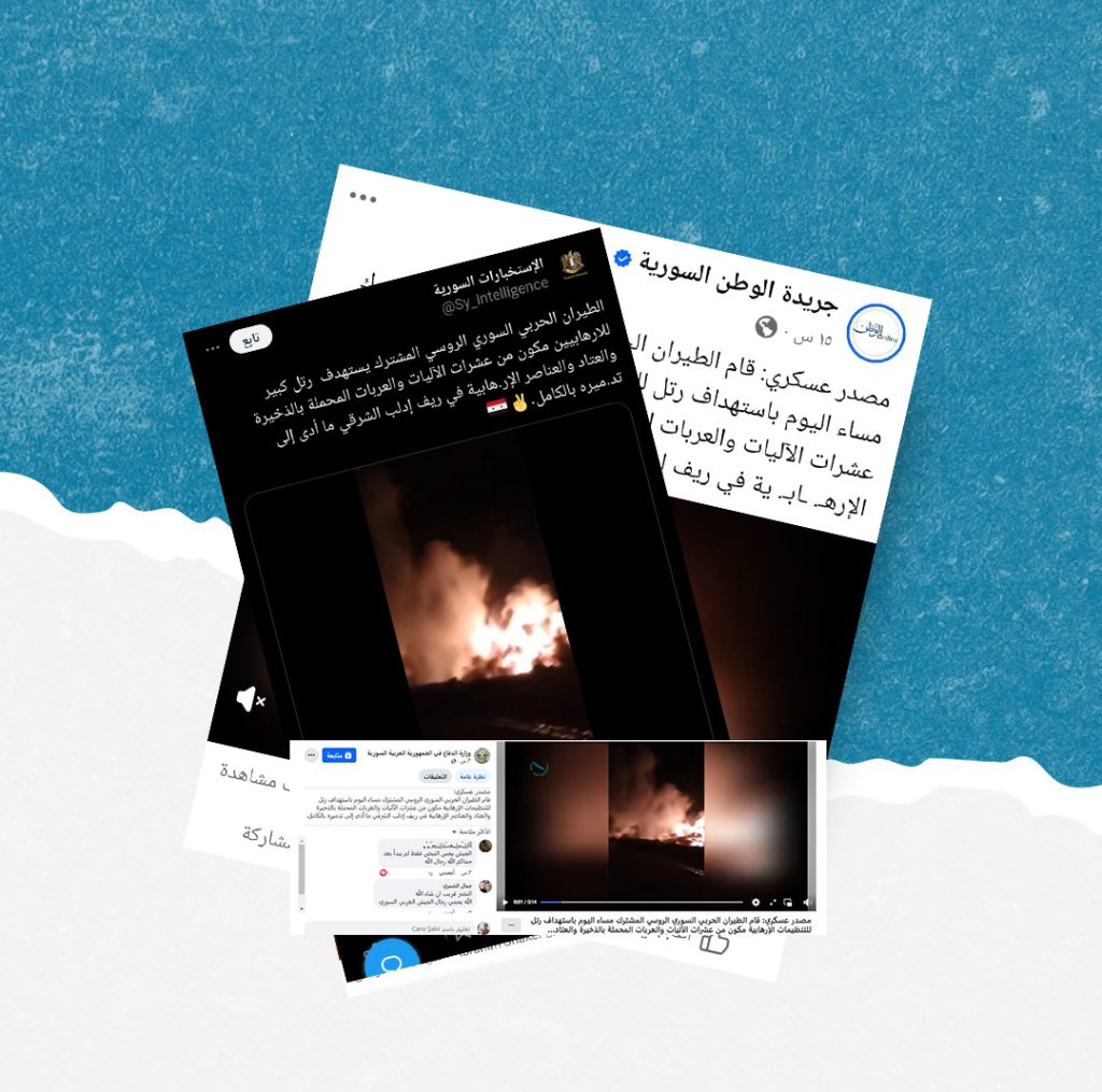 - ونشرت صفحات معارضة منشورات قالت فيها إن المقطع المقصود تم تداوله على أنه لقصف رتل للميليشيات الإيرانية في مدينة البوكمال بريف دير الزور الشرقي، وأرفقته مع تصحيح.